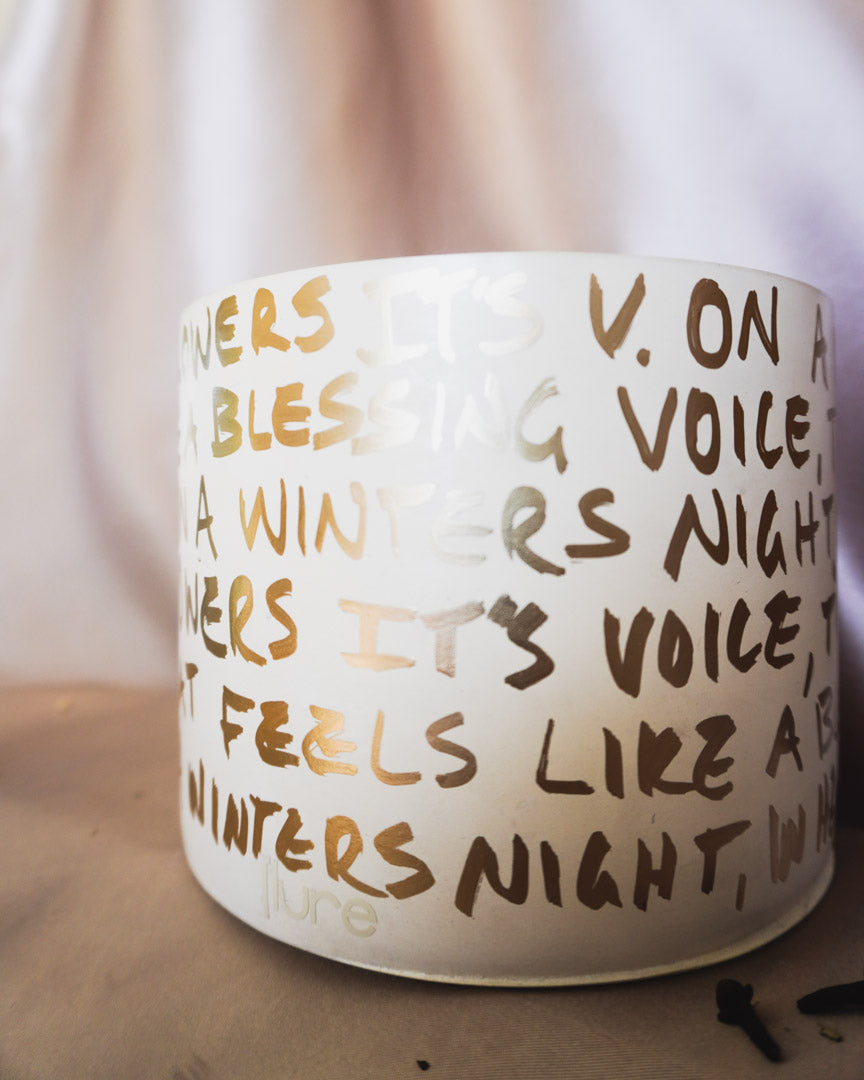 Designed to be front and centre at your table, with stunning metallic gold script writing around the vessel in capitals; "On a winter's night, when the world lowers its voice, there is a hush that feels like a blessing, it's Holy."